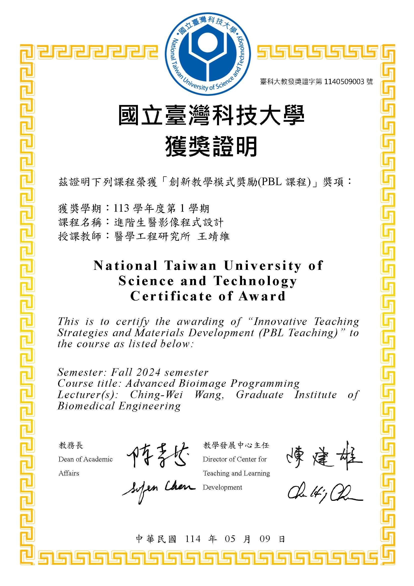 | 2 | BE5053701 | 進階生醫影像程式設計 | 王靖維教授 |