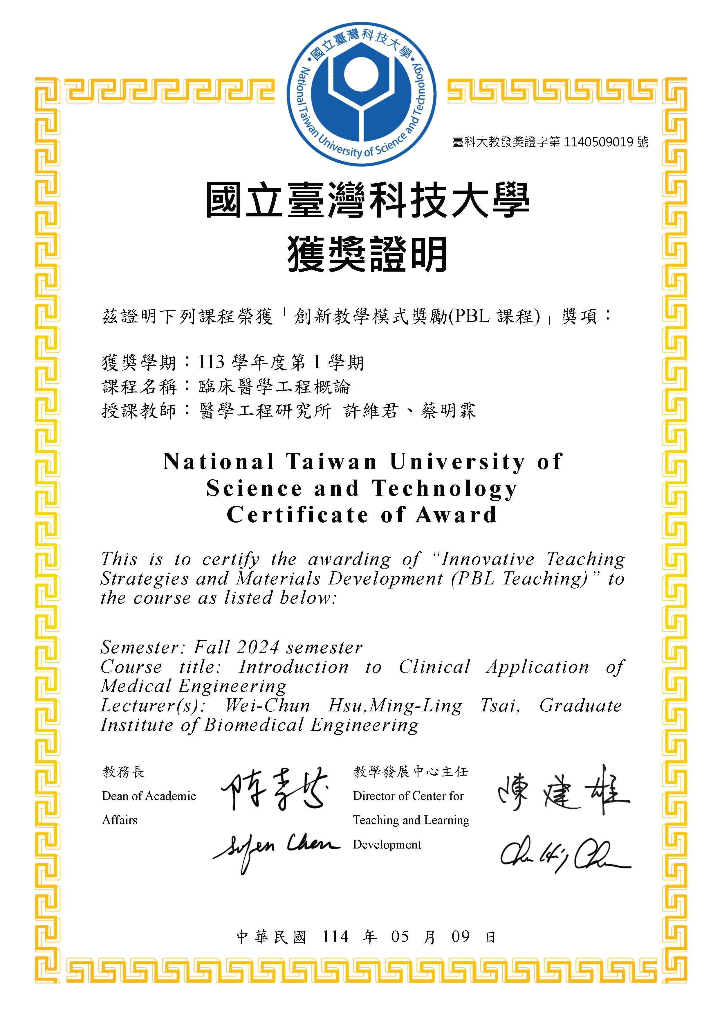 【賀!】本所王靖維教授、許維君教授、高震宇副教授榮獲本校113-1創新教學模式獎勵(PBL 課程)